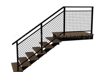 Металлические перила для лестничного марша с рисунком в виде решетки. Дополнительно может быть изготовлен деревянный поручень. Расчет стоимости работ индивидуально для каждого проекта от указанной цены за погонный метр. Возможна установка перил на готовое изделие. Для заказа оставьте свой телефон в форме заявки на сайте.
